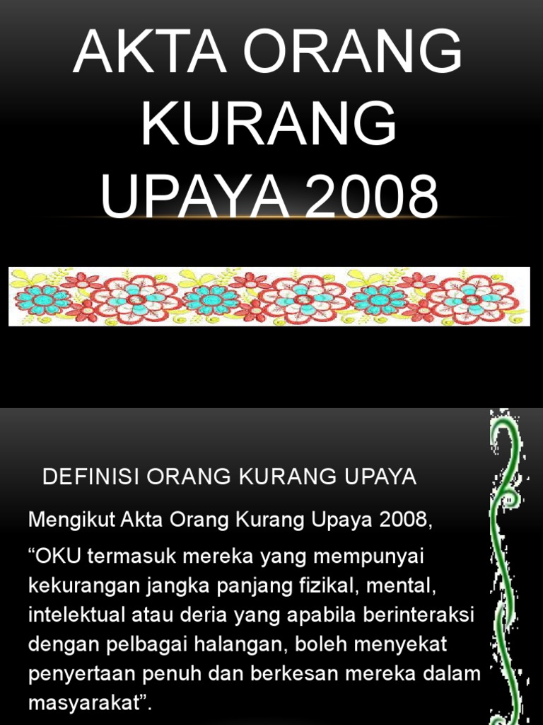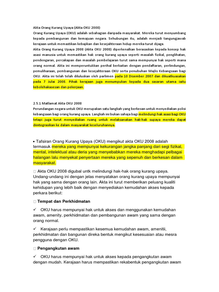 Menurut akta orang kurang upaya (oku) pada tahun 2008, definisi orang kurang upaya adalah seseorang yang mempunyai kekurangan jangka panjang dari segi fizikal, mental, intelektual atau deria yang apabila berinteraksi dengan pelbagai halangan, boleh menyekat penyertaan penuh dan. Sejak dilahirkan dan kesan kemalangan atau penyakit tertentu 3. Kesukaran yang dilalui oleh oku 4. Kenapa jadi orang kurang upaya ? Faktor yang menghalang oku di malaysia mendapatkan pekerjaan termasuklah sikap negatif dan diskriminasi ekoran kurangnya kesedaran mengenai keupayaan golongan tersebut. Presiden persatuan oku sentral, ras adiba radzi berkata, akta sedia ada ketika ini tidak mampu memberikan kesedaran kepada masyarakat agar tidak. Ketika ini katanya, kemudahan untuk oku yang mengikut spesifikasi yang diperlukan golongan berkenaan penting dalam memastikan masyarakat menghormati keperluan. Akta oku telah diluluskan di parlimen ( dewan negara ) pada 24 disember 2007 dan telah diwartakan pada 24 januari 2008 dan dikuatkuasakan pada 7 julai 2008. Seorang lelaki memberitahu tidak pergi menunaikan solat jumaat di masjid selama 20 tahun kerana tidak ada kemudahan disediakan untuk orang kurang upaya (oku). Akta orang kurang upaya, oku 2008 perlu dipinda dan ditukar kepada akta diskriminasi oku bagi memelihara kepentingan golongan itu. Malaysia akta 685 akta orang kurang upaya 2008 tari kh perkenan diraja. Mengikut akta orang kurang upaya 2008, oku termasuklah mereka yang mempunyai kekurangan jangka panjang fizikal, mental, intelektual atau deria yang apabila berinteraksi dengan pelbagai halangan, boleh menyekat penyertaan penuh dan berkesan mereka dalam masyarakat. Mengikut akta orang kurang upaya 2008, oku termasuklah mereka yang mempunyai kekurangan jangka panjang fizikal, mental, intelektual atau deria yang apabila berinteraksi dengan pelbagai halangan, boleh menyekat penyertaan penuh dan berkesan mereka dalam masyarakat.