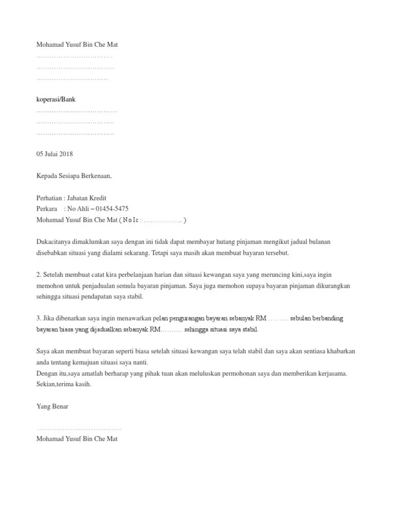 Berikut ialah contoh surat rayuan hati yang boleh digunapakai untuk yang mengikut suami atau mengikut isteri (tengok siapa yang dapat tawaran dahulu), sebagai pengiring warga emas dan secara. Saya ingin memohon untuk membuat bayaran semula sebanyak rm 200.00 bagi pinjaman sarjana muda dan rm 200.00 bagi sarjana bagi setia bulan.jumlah kedua bayaran pinjaman adalah rm 400.ini adalah kerana saya menanggung perbelanjaan dua orang adik termasuk seorang oku. Surat rayuan ialah surat yang digunakan untuk membuat rayuan atau permohonan kali kedua untuk mendapatkan sesuatu permohonan yang telah dibuat sebelum ini. Contoh surat permohonan kredit di bank bri via serviceiklan.com. Sila ikut format di bawah dan sesuaikan dengan situasi semasa anda.