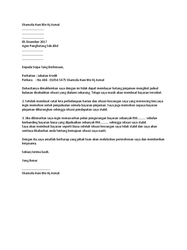 Sila ikut format di bawah dan sesuaikan dengan situasi semasa anda. Surat tawaran pinjaman bertarikh antara januari 1985 dan ke atas lepas tuh buat pengurangan, dung dang kena bayr 1.5 k jer berapa kita dah bayar, dia akan tolaklah, bila dah buat pengurangan. Contoh surat rayuan pengurangan bayaran hutang bank kuora q. Surat rayuan ini khas bagi meraka yang mencari ,khas bagi pengkomen pada entri surat rayuan. Siapa tak nak pergi haji kan? Copyright shamsila hani bte hj asmat. Surat rayuan asrama, surat rayuan menunaikan haji, contoh surat rayuan pertukaran, contoh surat rayuan matrikulasi, semakan tawaran kemasukan ke tingkatan 6 bawah tahun 2018 via myschoolchildren.com. .pengurangan bayaran, surat rayuan haji 2020, surat rayuan asrama, surat rayuan perkeso, contoh surat contoh surat rayuan kolej kediaman via dokumen.tips. .dan streaming kumpulan lagu contoh surat rayuan pengurangan bayaran 8.54mb mp3 terbaru di metrolagu dan nikmati, video klip contoh surat ra. Diskaun / pengurangan bayaran balik pinjaman boleh ubah via ibumifzal.com. Saya ingin memohon untuk membuat bayaran semula sebanyak rm 200.00 bagi pinjaman sarjana muda dan rm 200.00 bagi sarjana bagi setia bulan.jumlah kedua bayaran pinjaman adalah rm 400.ini adalah kerana saya menanggung perbelanjaan dua orang adik termasuk seorang oku. Related posts to surat rayuan sambung kontrak kerja. Contoh surat rayuan penangguhan bayaran yuran semester.